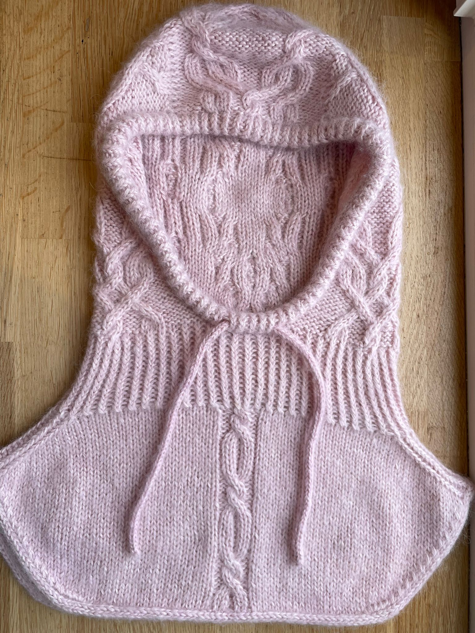 La STOCKHOLM Hood est tricotée sans coutures, combinant un fil LACE en mohair et soie avec un fil FINGERING en cachemire, soie et alpaga. Le col débute par un montage provisoire sur câble, permettant un tricot en rond en côte semi-torse 1/1 avec des augmentations doubles. La capuche est ensuite réalisée en torsades, incluant l’ouverture pour le visage, puis le sommet de la tête est fermé à l’aide de rangs raccourcis et de diminutions. Enfin, les mailles provisoires sont reprises pour tricoter le plastron en jersey, bordé d’une I-cord. Une coulisse est formée autour de l’ouverture du visage en relevant les mailles, puis une cordelette en I-cord est insérée.
